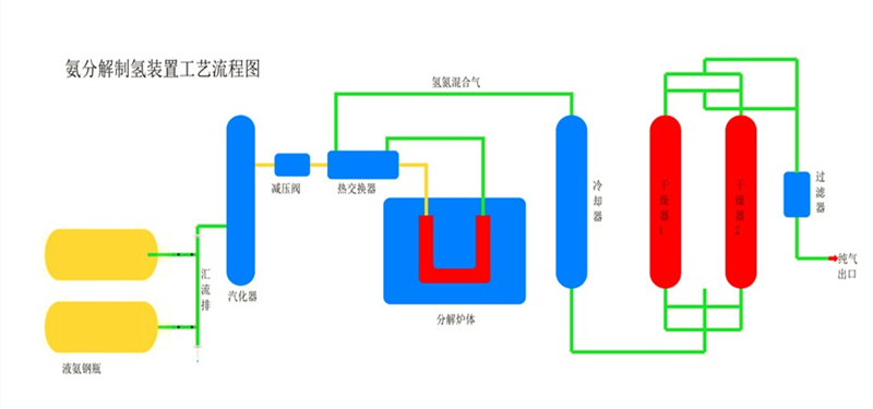 氨分解制氫是以液氨為原料,在鎳催化劑的作用下,加熱800℃-850℃分解得到含氫75%,含氮25%的氫氮混合氣體。分解率可以達(dá)到99.9%。露點為-10℃。